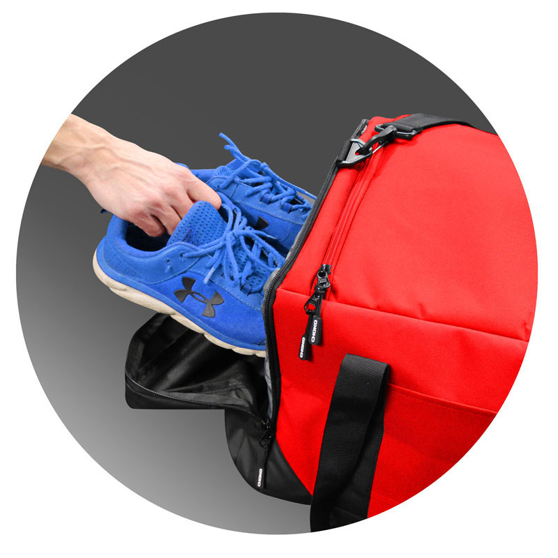 *Durable, water-resistant Polyester shell *45-liter capacity *YKK® zipper used for main compartment *Includes built in, vented shoe bag *Waterproof zippered compartment to keep wet items separate *Front exterior zippered pocket *Two padded handles with Velcro® closure *Adjustable, padded shoulder strap