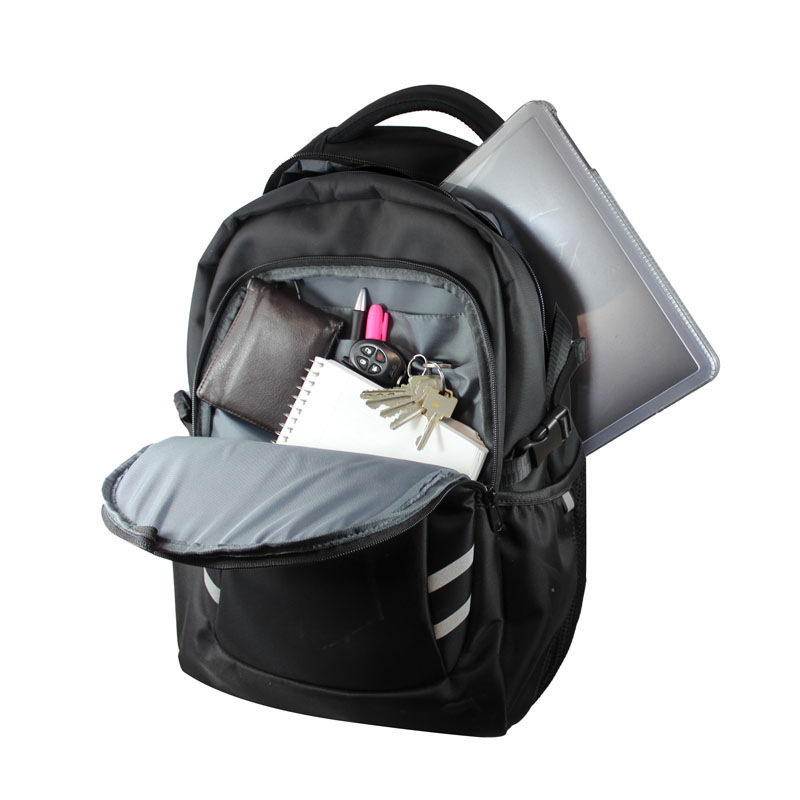 *Nylon shell *Reflective accents *Padded, adjustable shoulder straps *Padded top grab handle *Three zippered compartments *Large compartment has a padded sleeve with Velcro® closure for electronic items *Business card holder for ease of labeling *Two generous side pockets for water bottle holders *Side compression straps